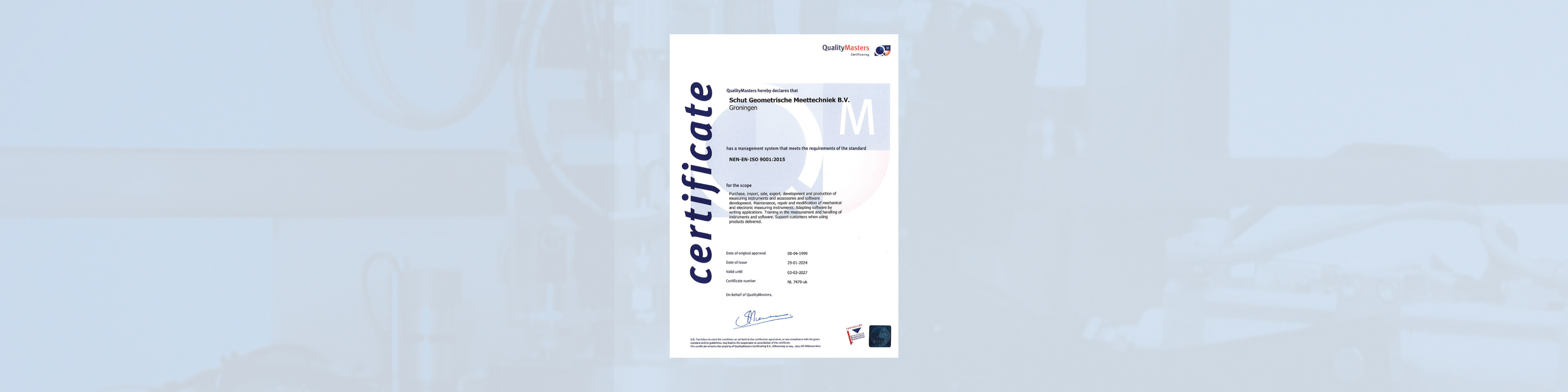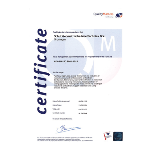 Schut Geometrische Meettechniek BV Groningen, The Netherlands has a management system that meets the requirements of the standard: NEN-EN-ISO 9001: version 2015.