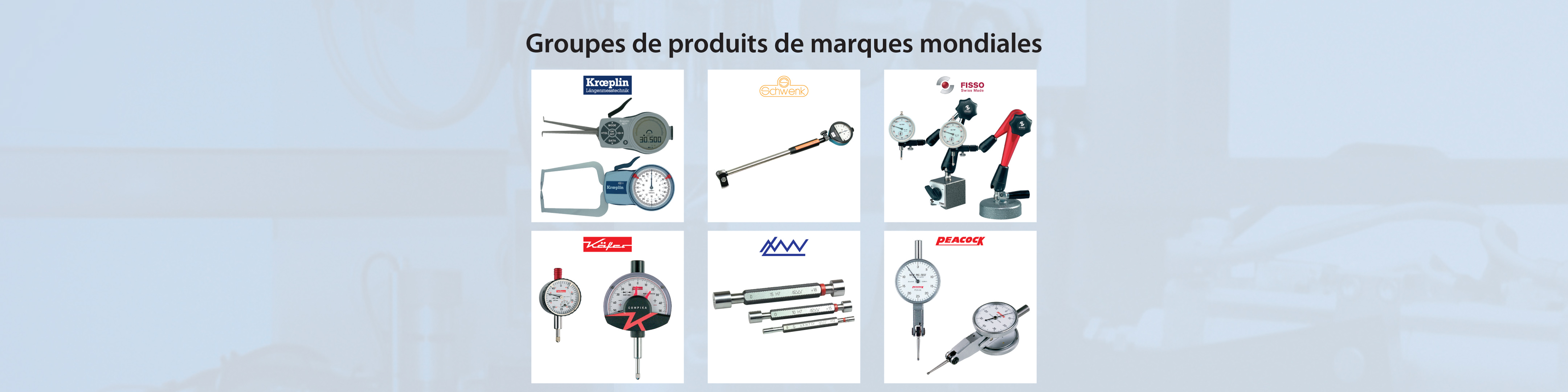 Une grande variété des produits de qualité des grands fabricants comme Fisso (supports de comparateur), Käfer et Peacock (comparateurs), LMW (jauges), Martin + Tschopp (piges de contrôle), Schwenk et Krœplin (mesureurs d’intérieur et d’extérieur) et Helios-Preisser et DEMM (instruments de mesure).