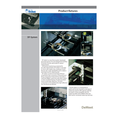 DF-System is a fixture system developed and produced by Schut and designed for constructing 3D product fixtures, particularly for optical measurements, and is fully compatible with the measuring table of the DeMeet measuring machines.