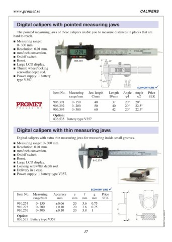 The pointed measuring jaws of these calipers enable you to measure distances in places that are