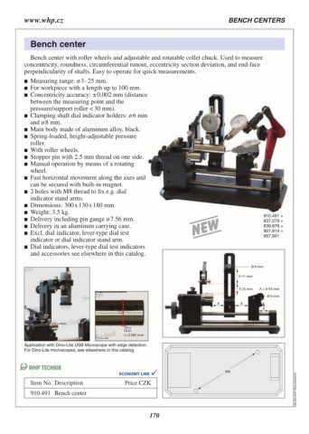 Bench center with roller wheels and adjustable and rotatable collet chuck. Used to measure